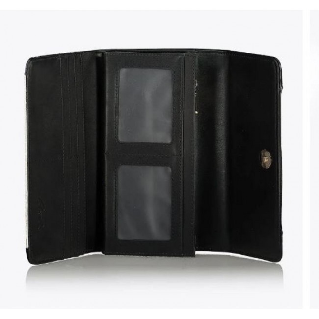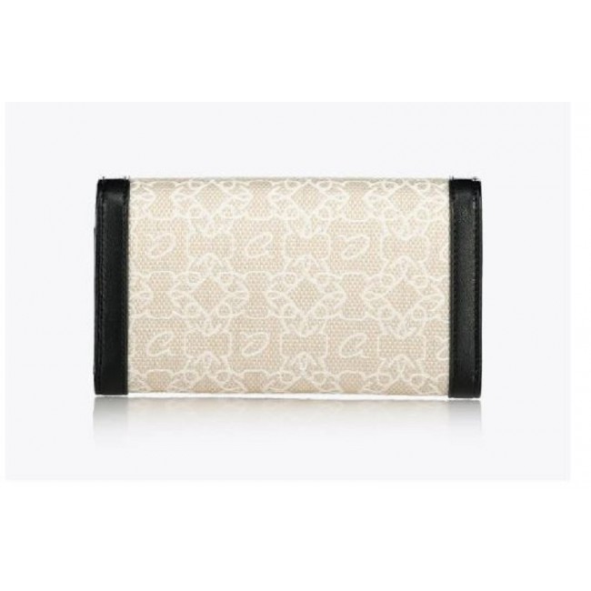 Portafoglio da donna a tre ante con patta, realizzato in canvas con disegno monogramma 'a' ricamato e dettagli in similpelle. Due scomparti per banconote, tasca interna con cerniera per monete e molteplici fessure per carte. Chiusura a scatto. Un elegante portafoglio per portare con stile denaro e carte per tutta l'estate.